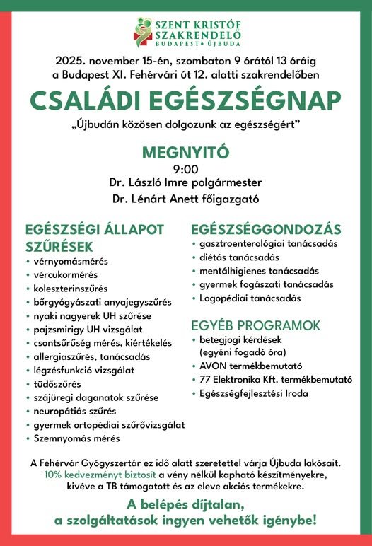 2025. november 15-én, szombaton 9 órától 13 óráig a Szent Kristóf Szakrendelőben Budapest (XI. Fehérvári út 12) családi egészségnapot tartanak.