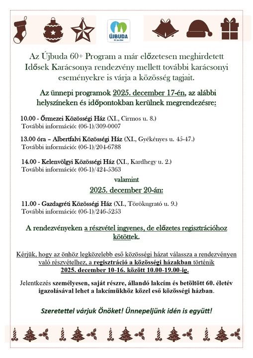 Az Újbuda 60+ Program a már előzetesen meghirdetett Idősek Karácsonya rendezvény mellett további karácsonyi eseményekre is várja a közösség tagjait.