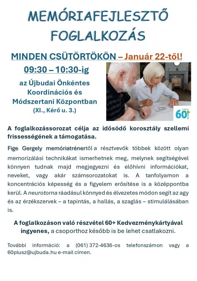Január 22-től minden csütörtökön 9.30-10.30 közöttA foglalkozások célja az idősődő korosztály szellemi frissességének támogatása. Új előadónk Fige Gergely memóriatréner. A foglalkozásokon a részvétel 60+ Kedvezménykártyával ingyenes, a csoporthoz később is be lehet csatlakozni. Címkék: 60+program60+ Programmemóriamemória fejlesztőfejlesztőagytornaagytréningmemória tréning